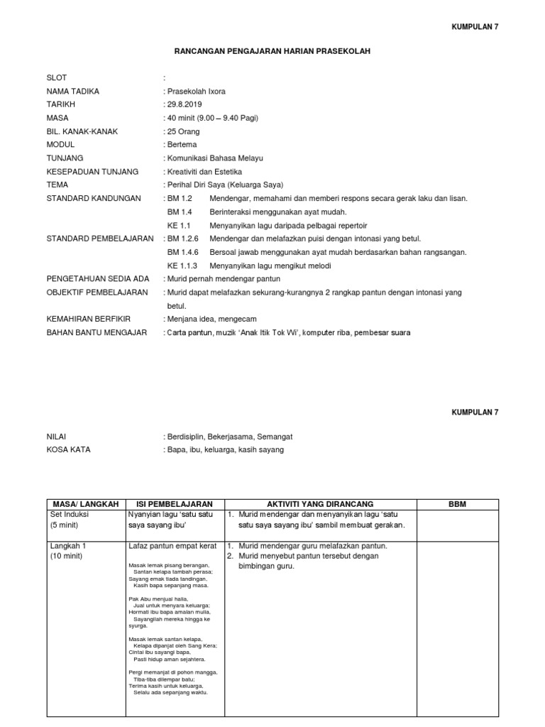 Rancangan Pengajaran Harian Prasekolah Kumpulan 7 Pdf